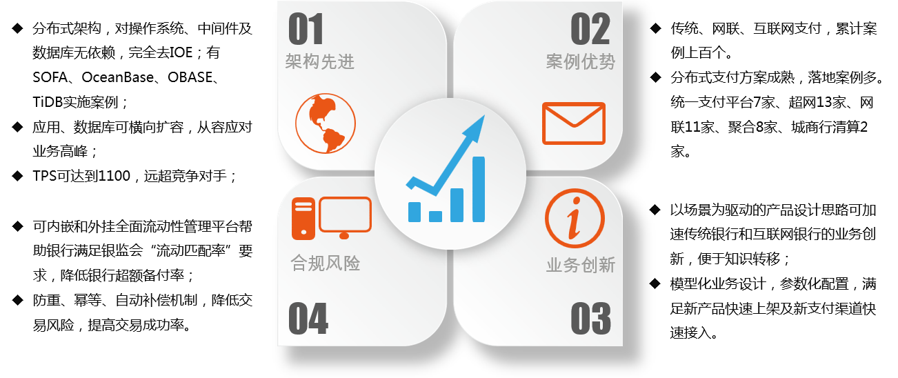 双中心双活部署,提升支付平台抗风险能力;优雅停机功能,降低运维痛苦指数;脱数据库自动回执,提升极端情况下客户体验;支付防火墙功能,降低极端情况下支付资金流失风险。